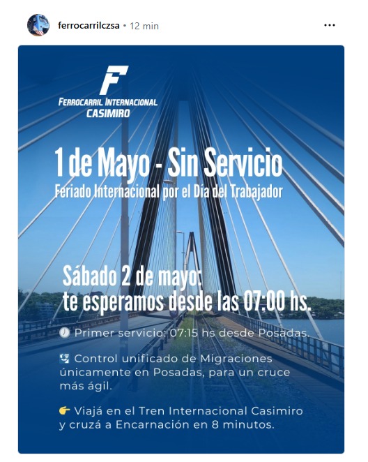 El Tren Internacional Casimiro, que une las ciudades de Posadas y Encarnación, no prestará servicio este viernes 1 de mayo debido al feriado por el Día Internacional del Trabajador.
