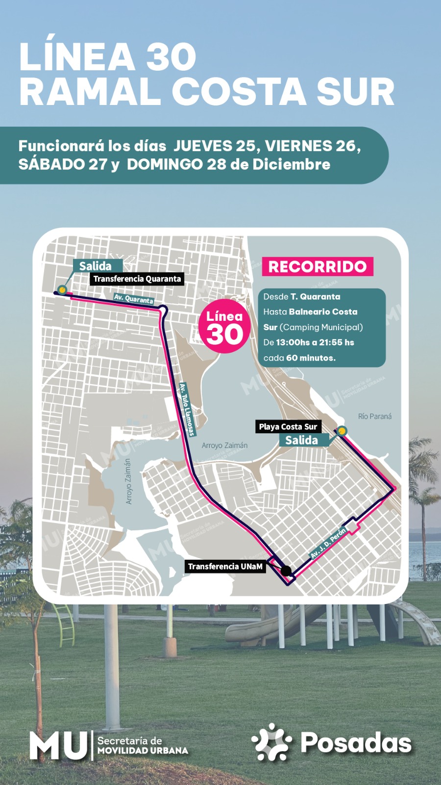 La Municipalidad de Posadas, a través de la Secretaría de Movilidad Urbana, informa a la comunidad que la Línea 30 – Ramal Costa Sur prestará un servicio especial en fechas clave.
