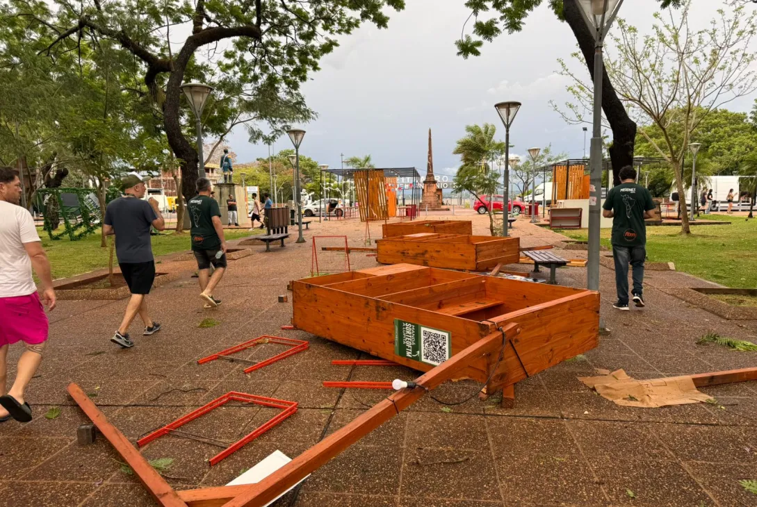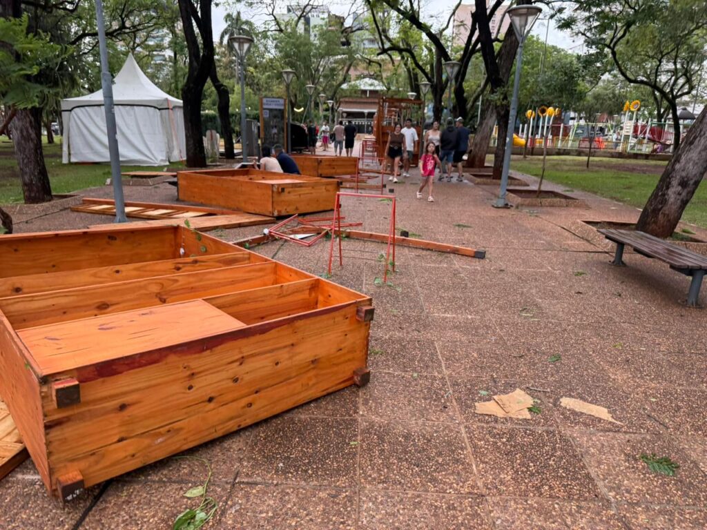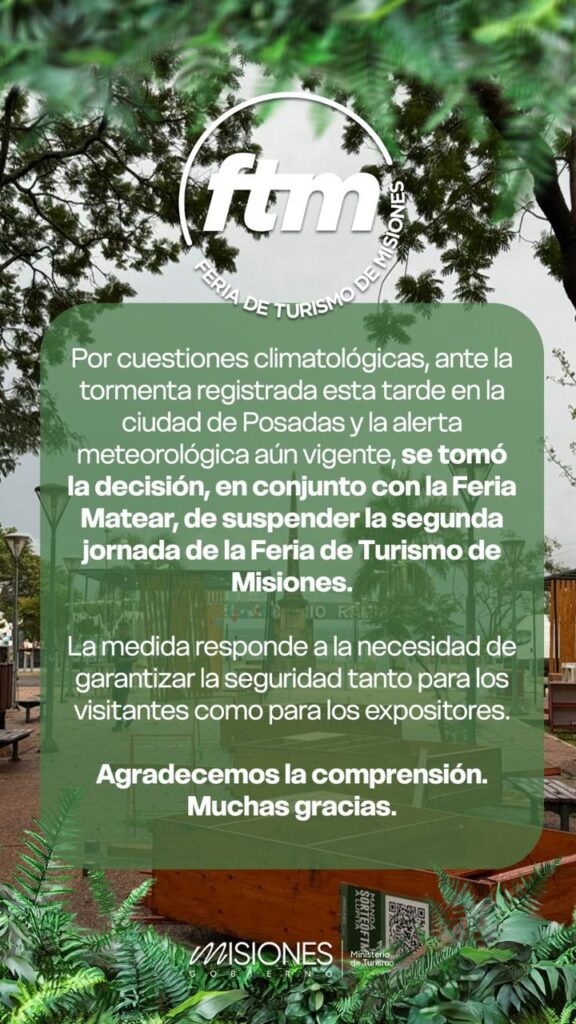 Debido a la tormenta registrada en la tarde de este domingo en Posadas y ante la alerta meteorológica aún vigente, el Ministerio de Turismo de Misiones, en conjunto con la Feria Matear, decidió suspender la segunda jornada de la Feria de Turismo de Misiones prevista para hoy.