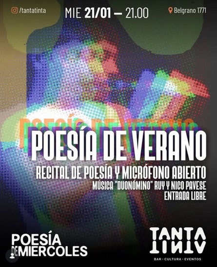Este miércoles 21 de enero habrá Recital de Poesía y Micrófono Abierto; junto a la música de “Duonómino” Ruy y Nico Pavese. Será en Tanta Tinta (Belgrano 1771) a partir de las 21 h.